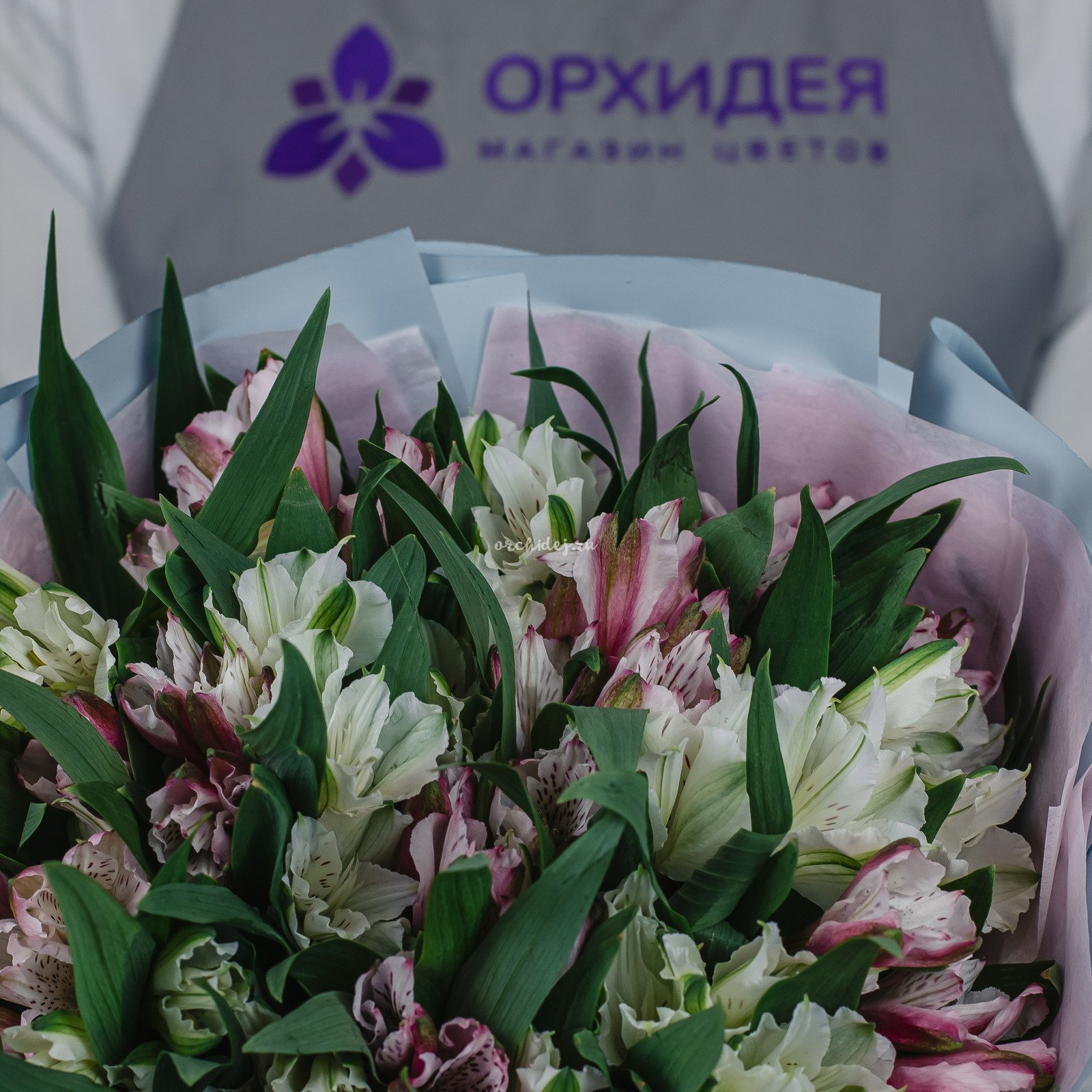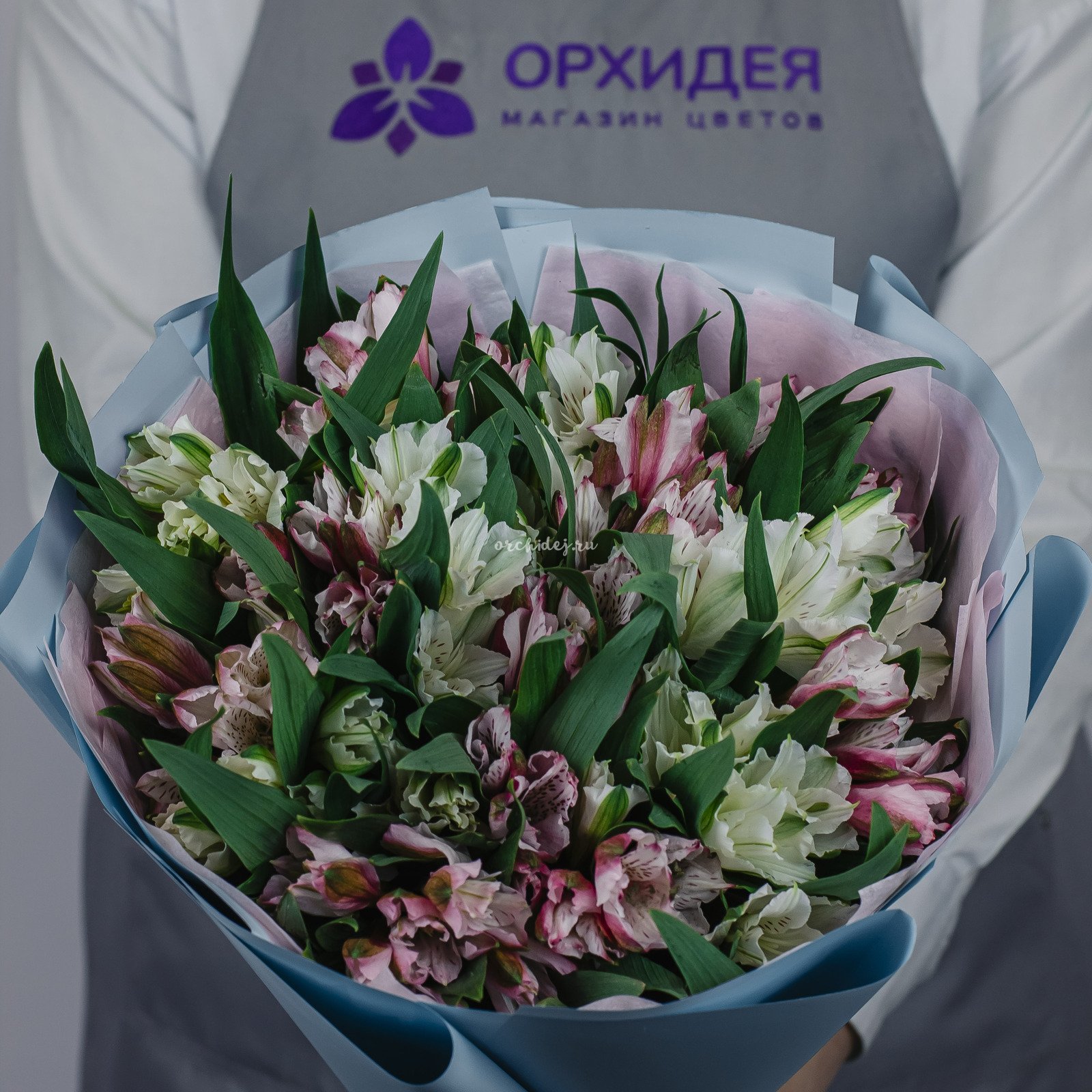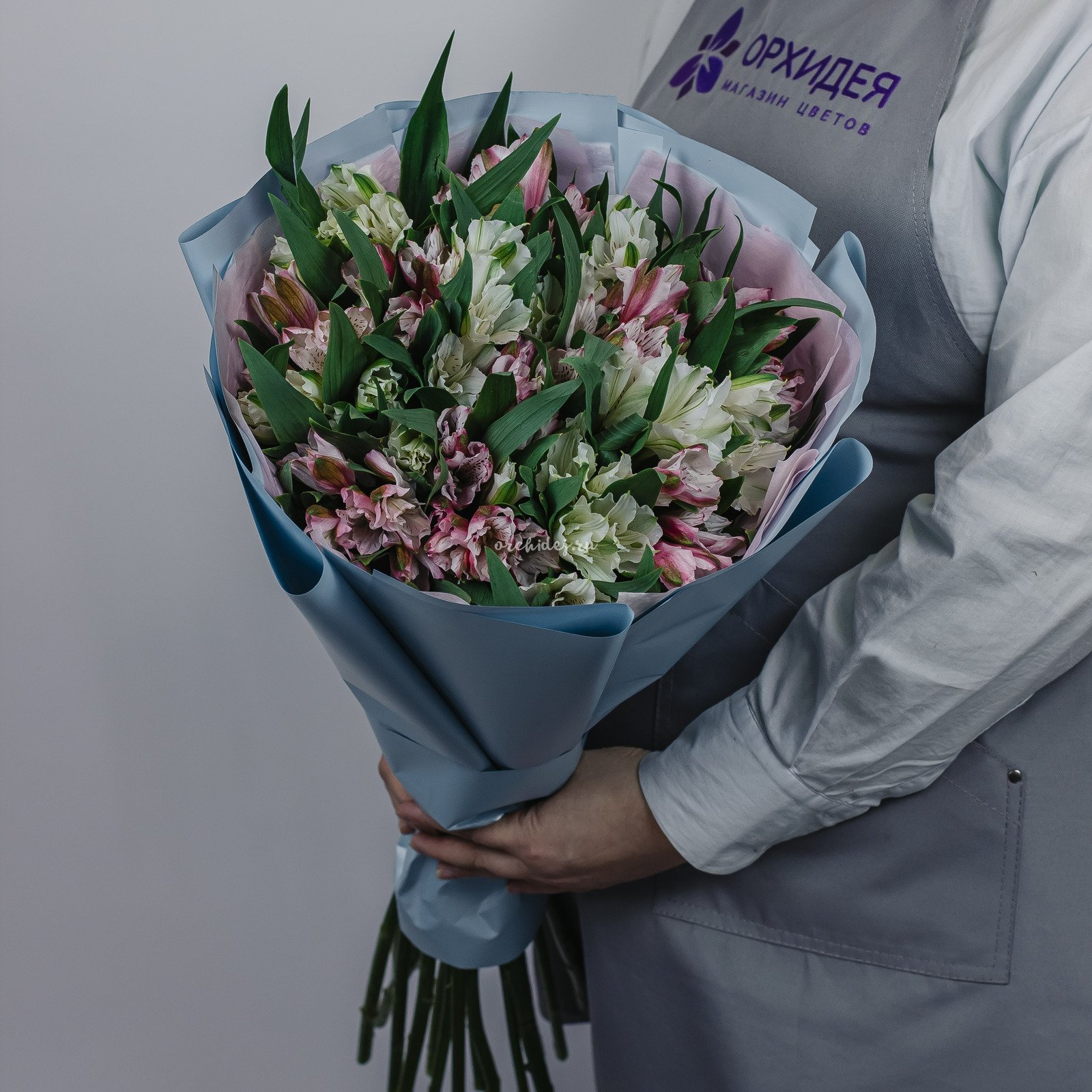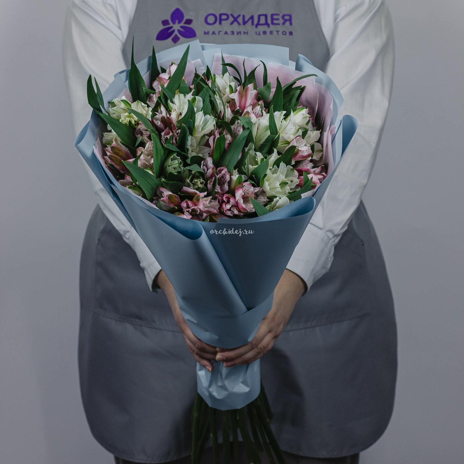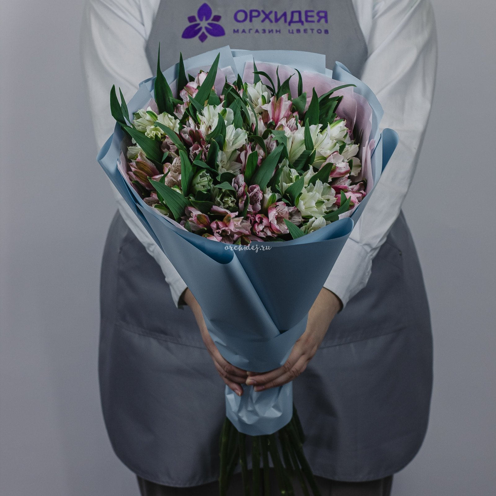 Состав: Альстромерия, Сложная упаковка 100, Тишью, Лента Атласная