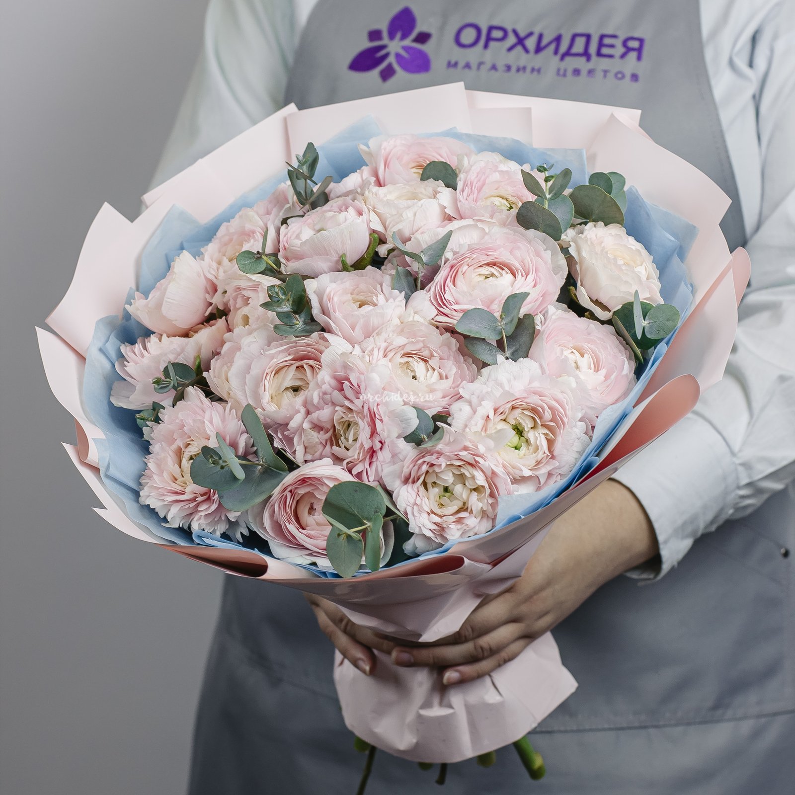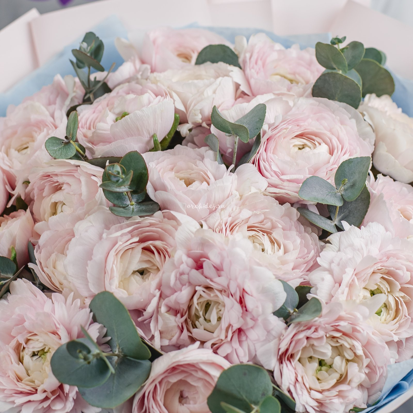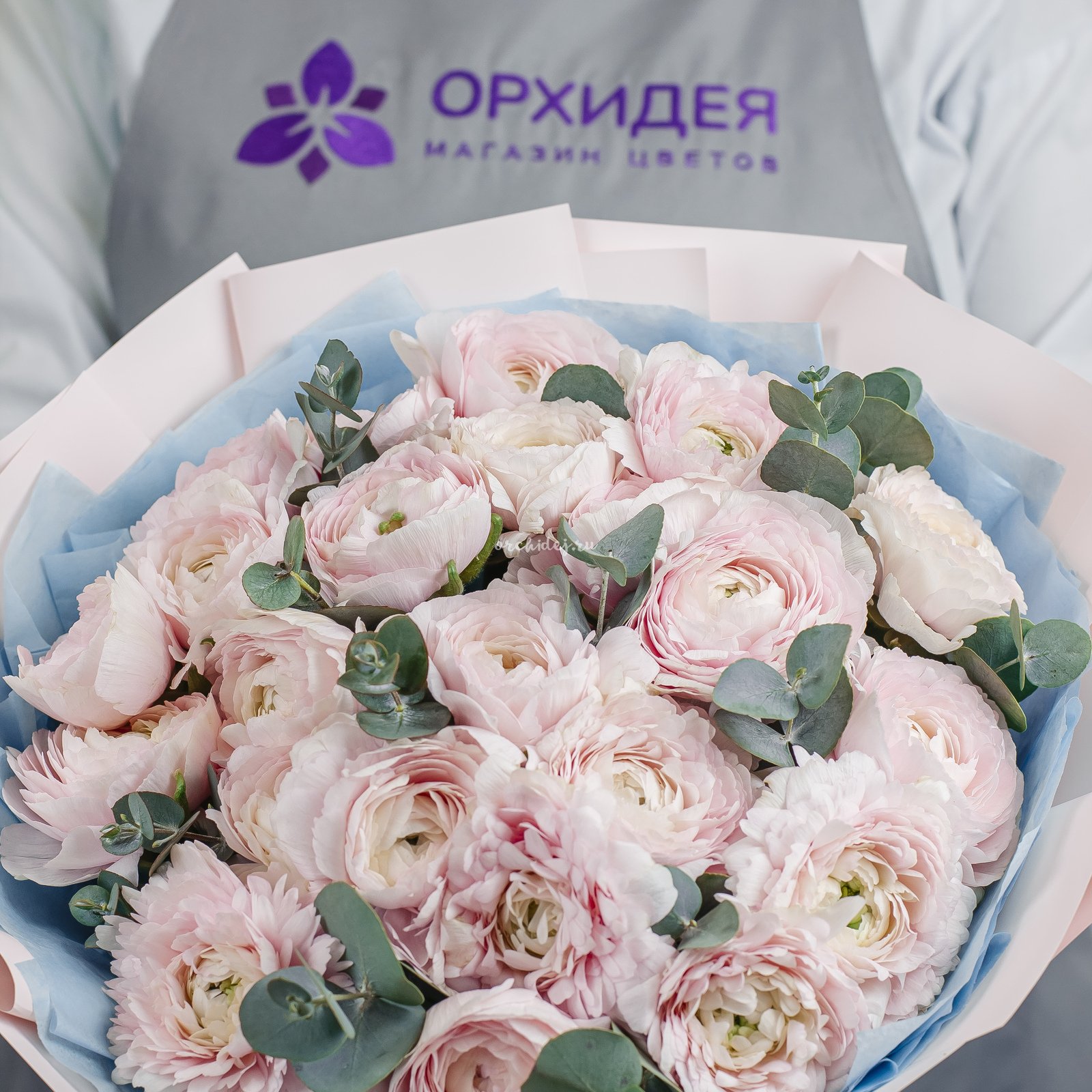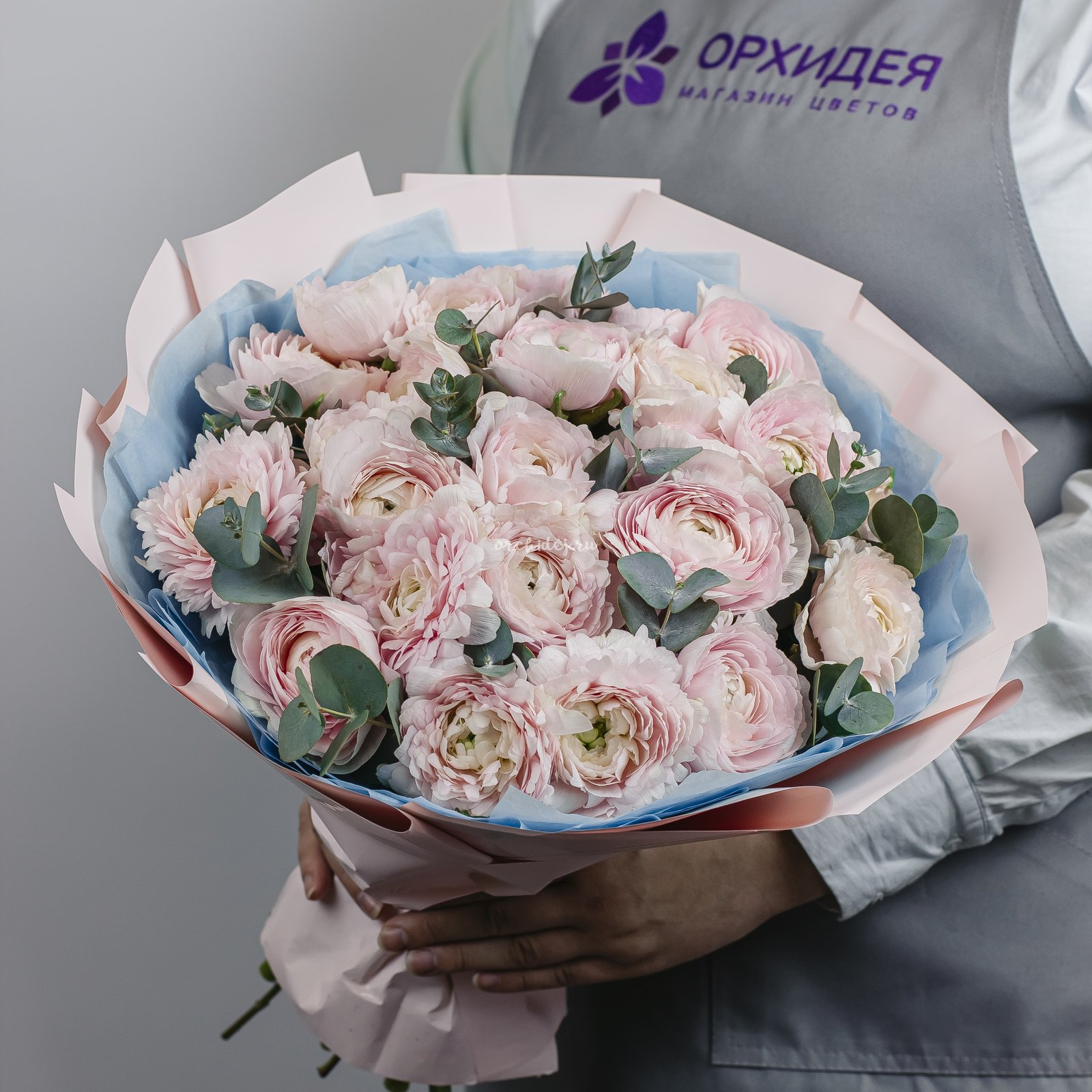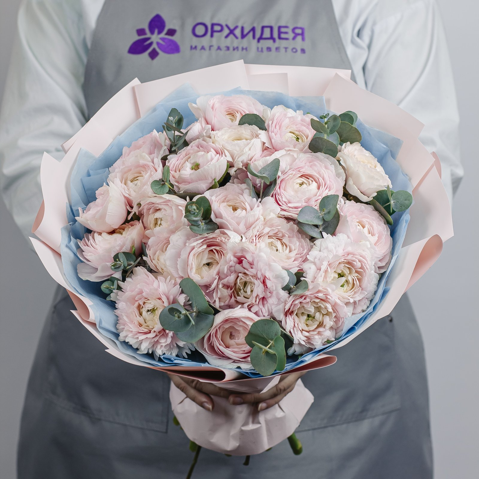 Состав: Ранункулюс, Эвкалипт пучок, Сложная упаковка 100, Тишью, Лента Атласная