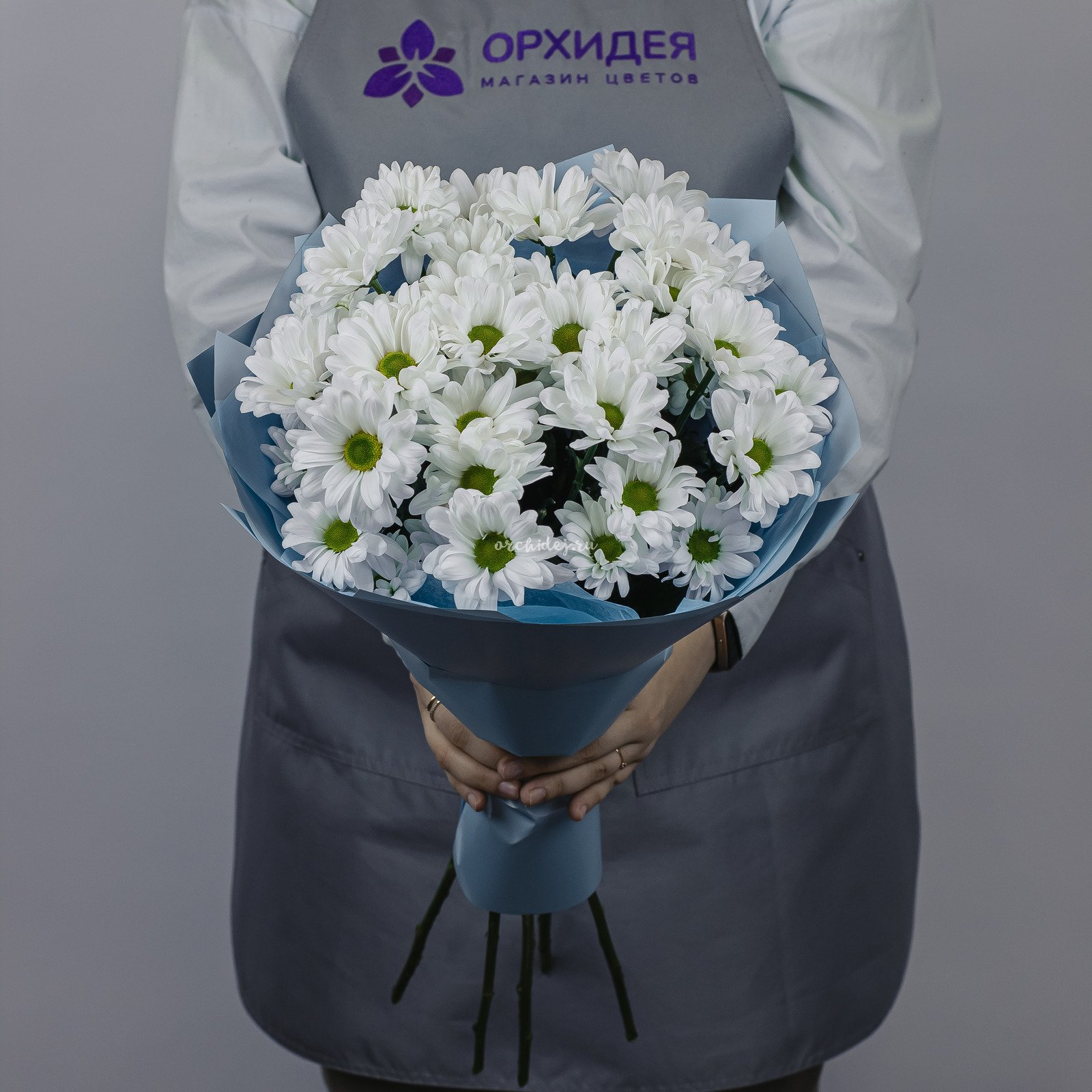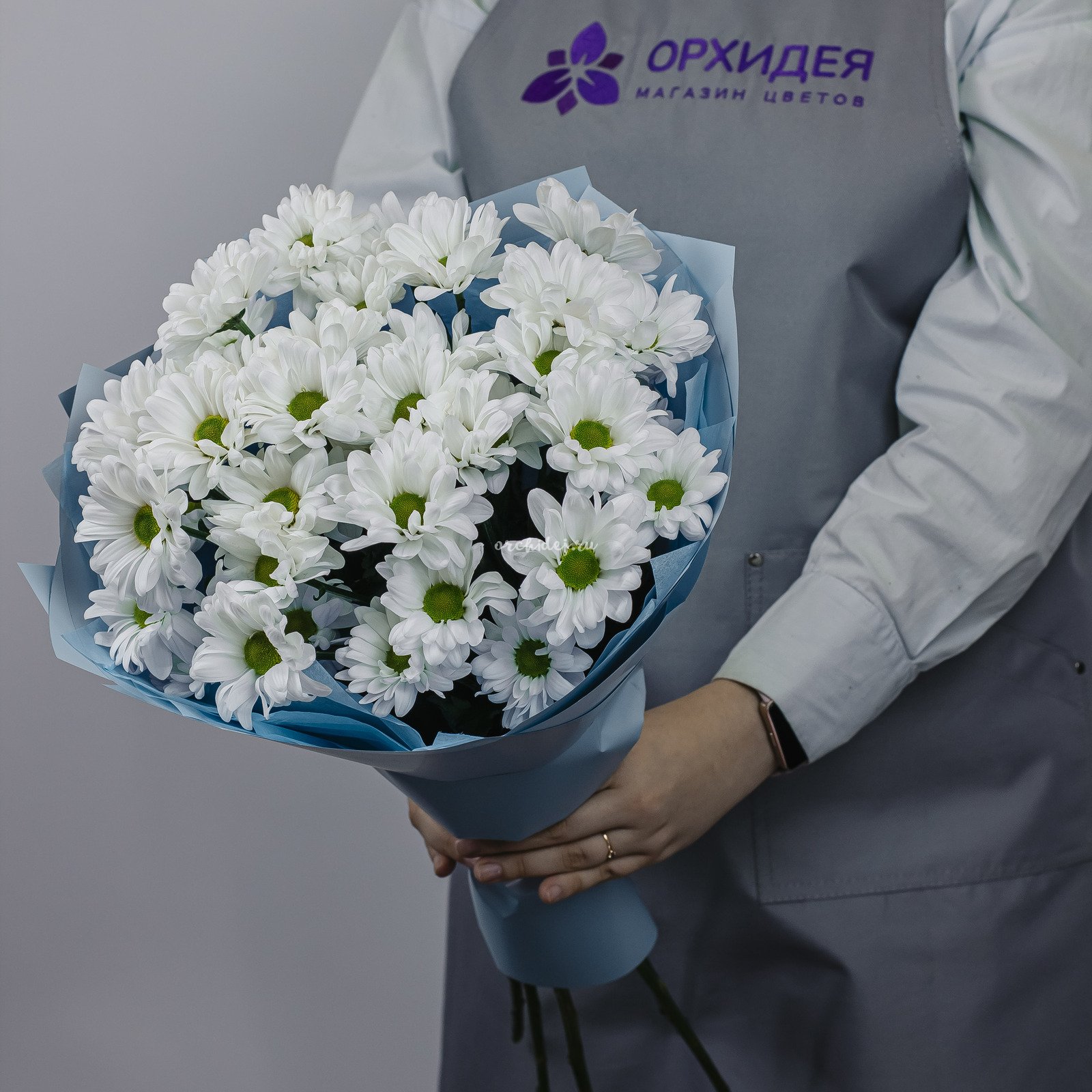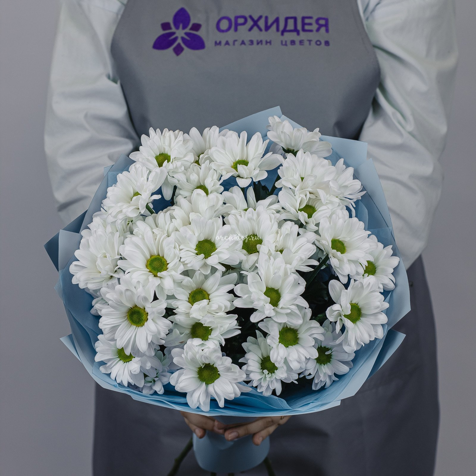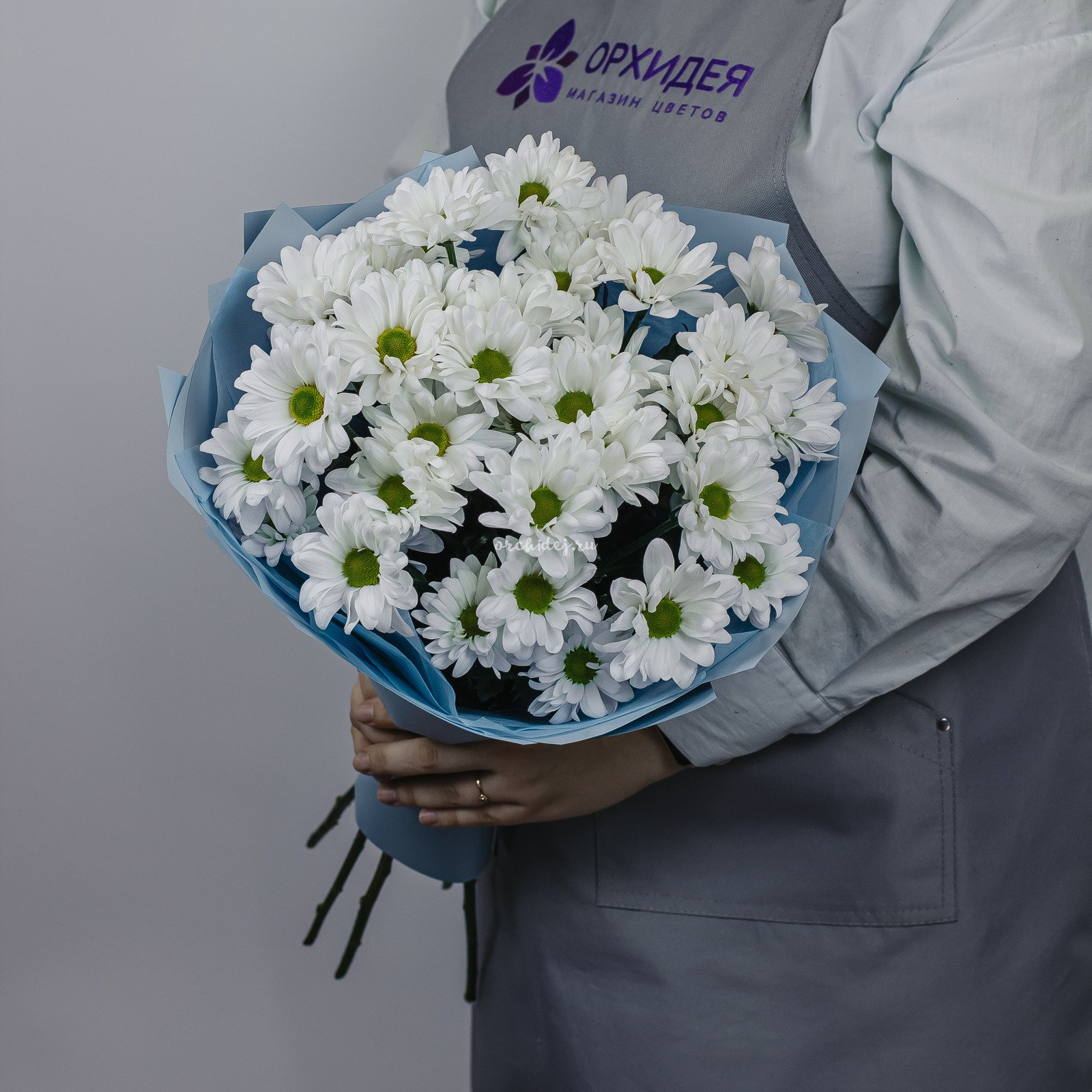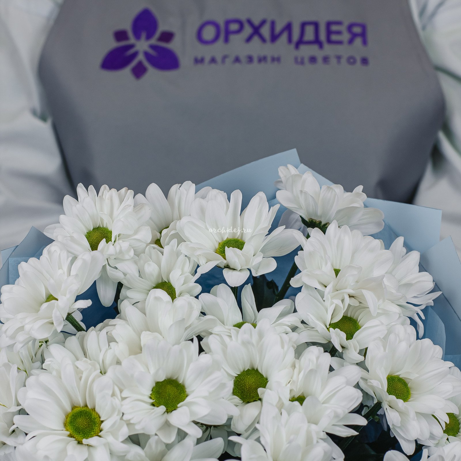 Композиция из живых цветов будет радовать получателя своей свежестью и красотой. Белые хризантемы, собранные в букет, создадут атмосферу праздника и гармонии в доме.