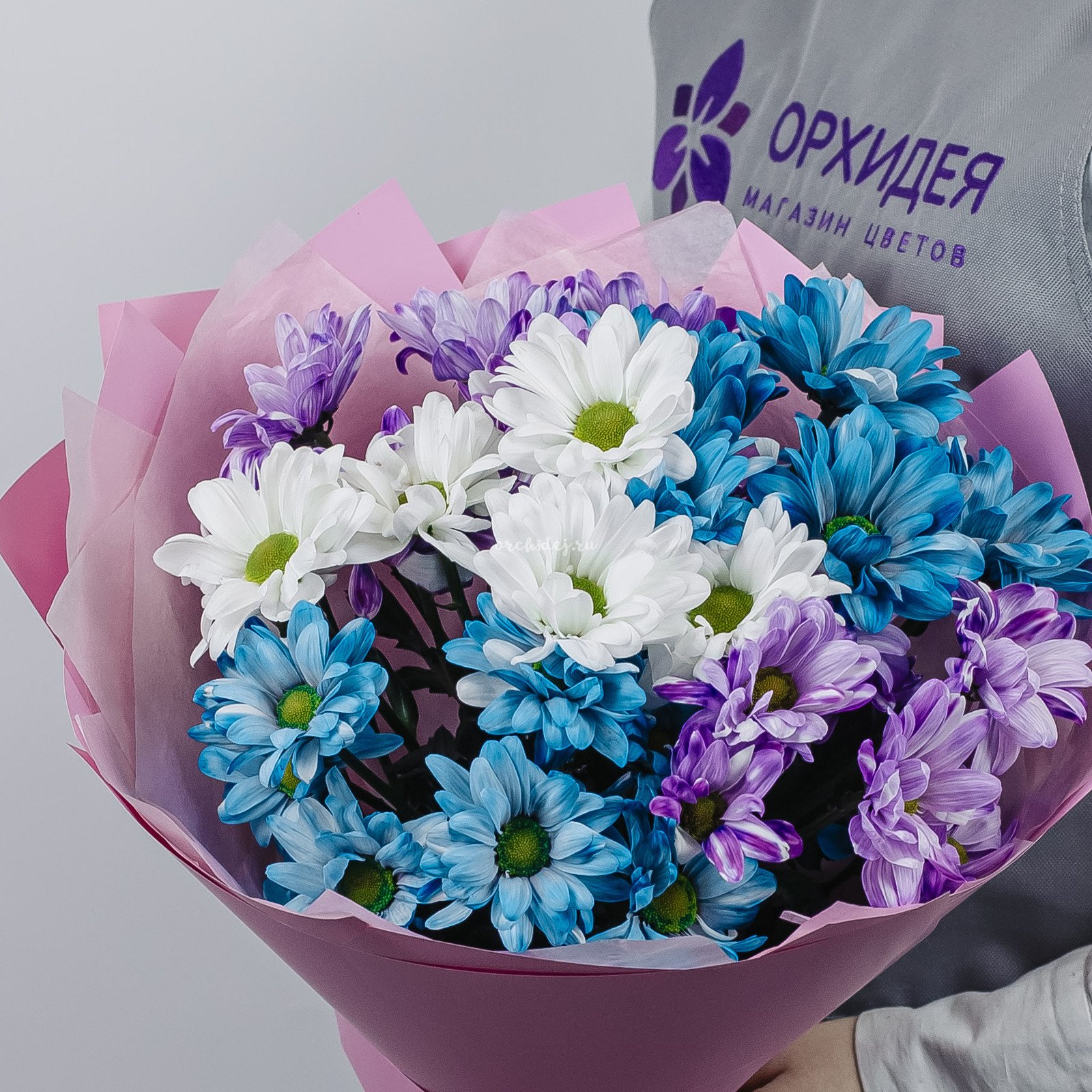 Состав: Хризантема ветка, Сложная упаковка 100, Тишью, Лента Атласная