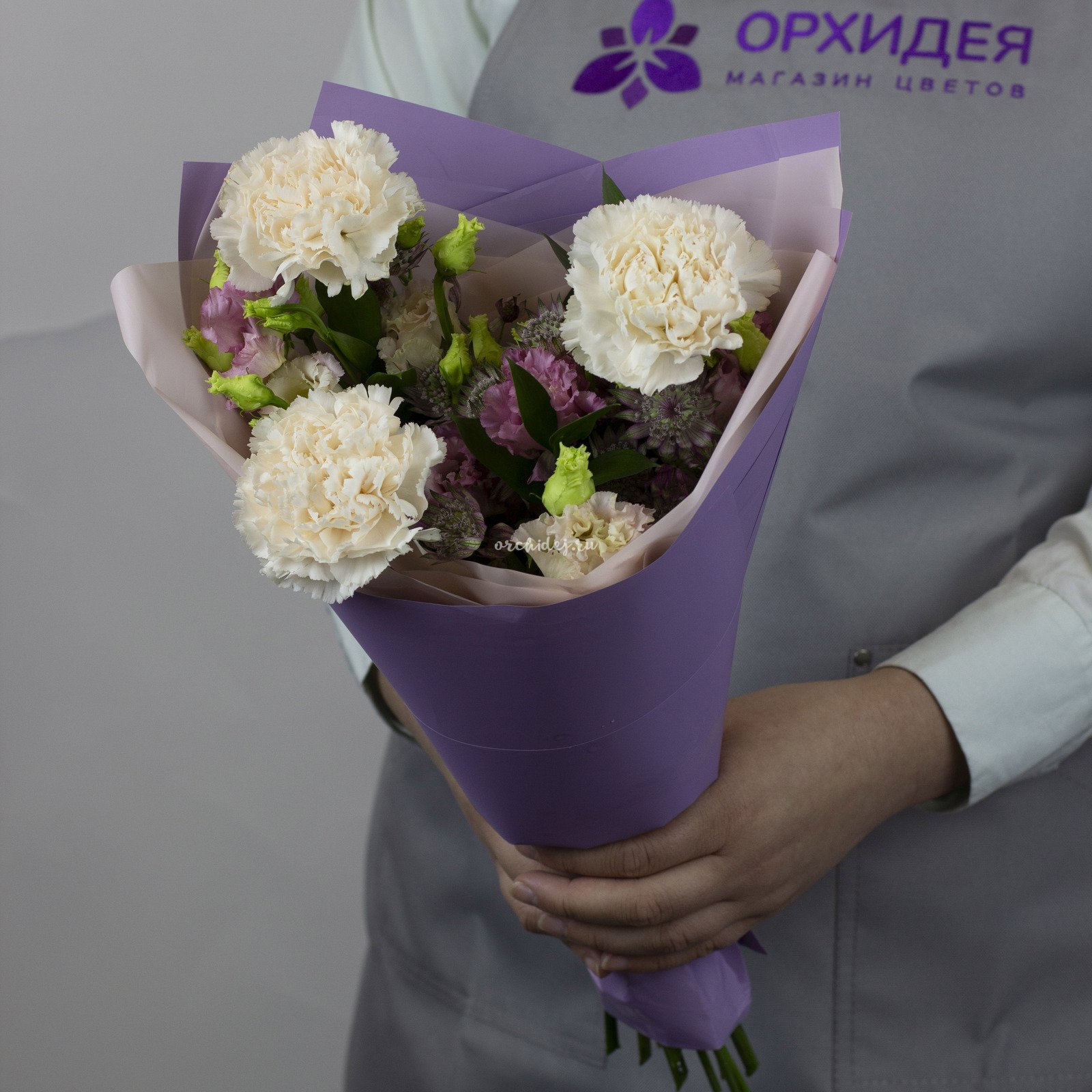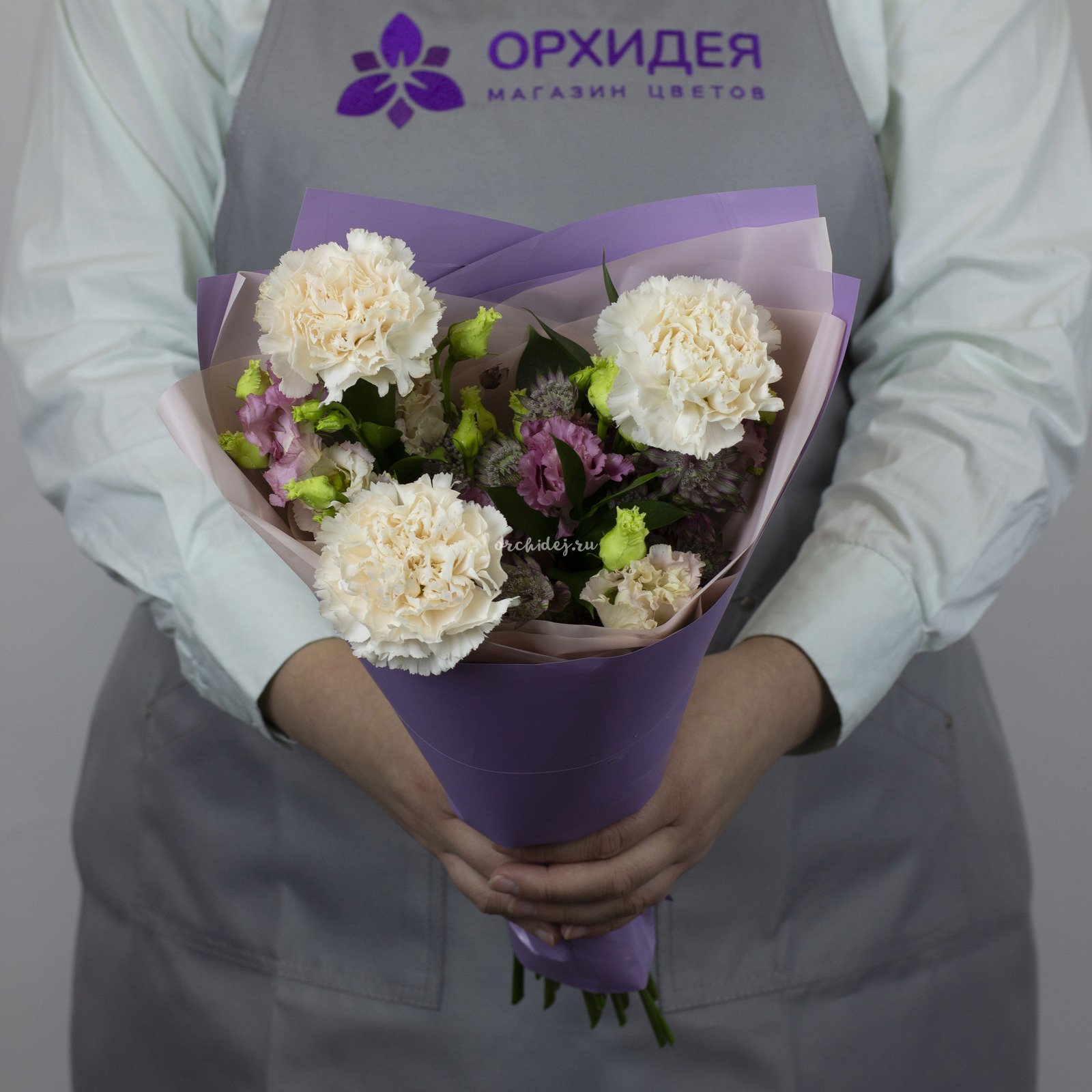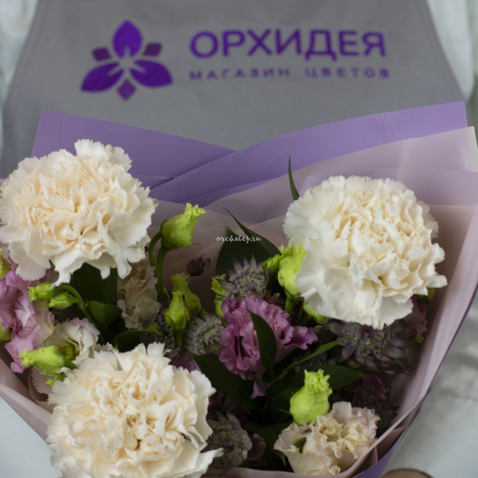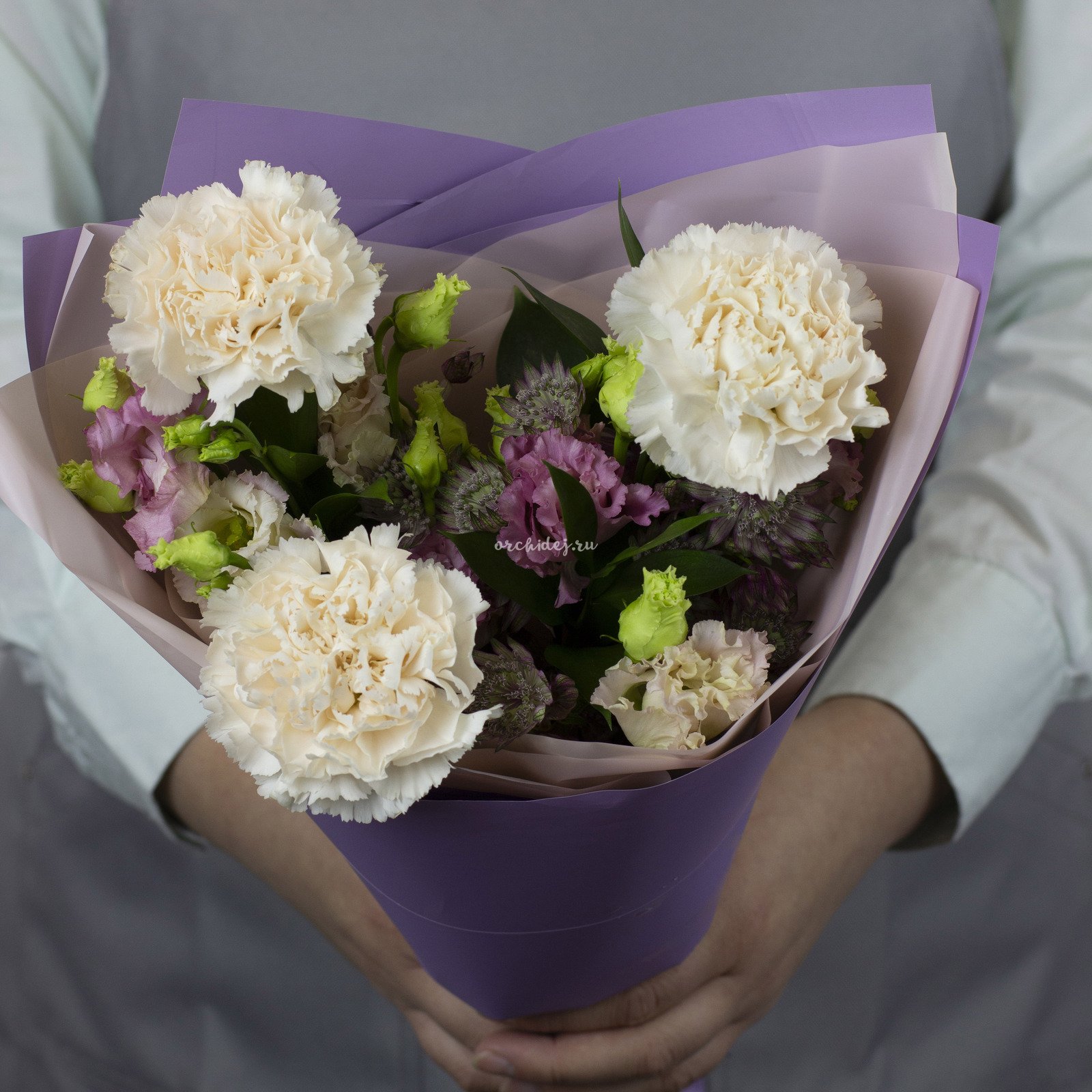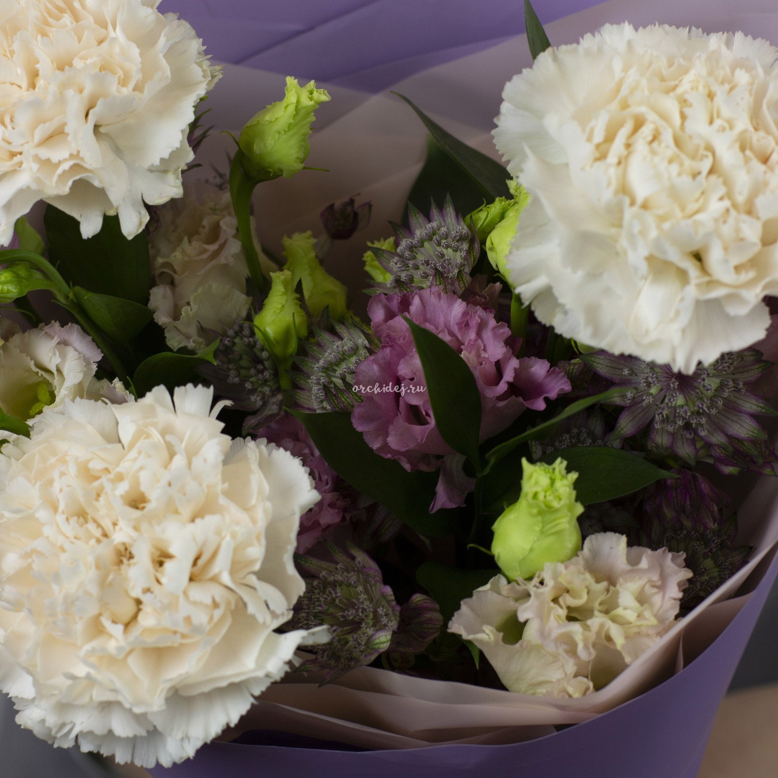 Состав: Гвоздика мунлайт, Лизиантус, Астранция, Зелень, Тишью, Сложная упаковка 100, Лента Атласная