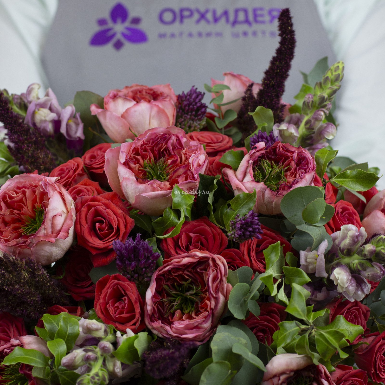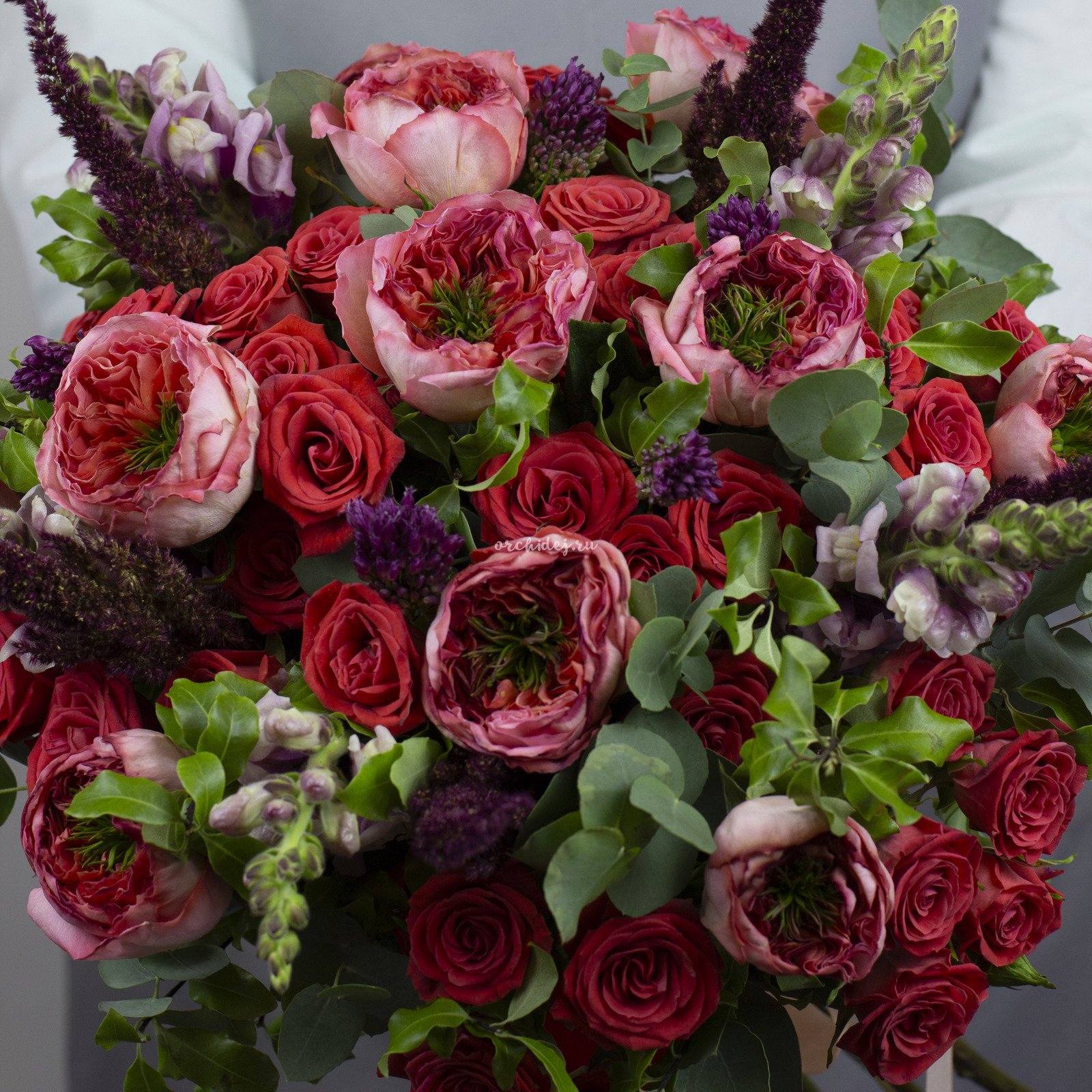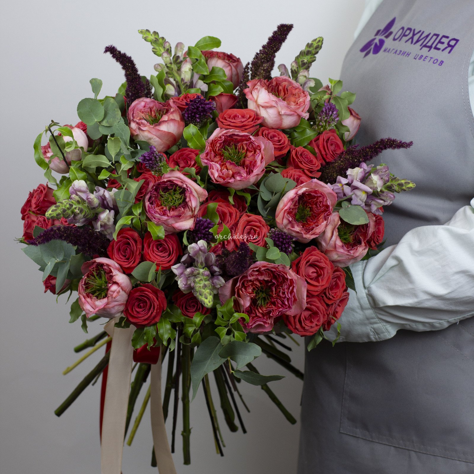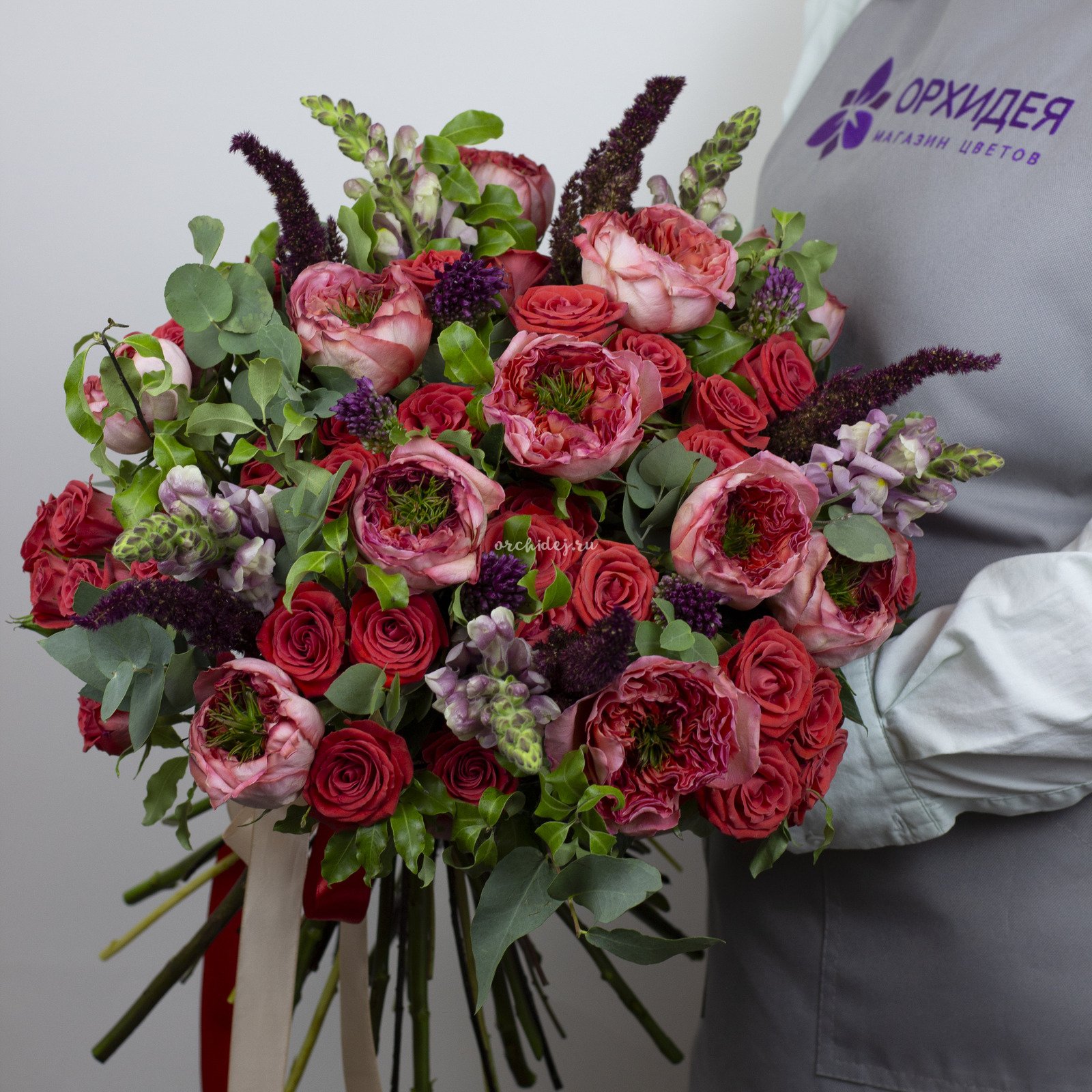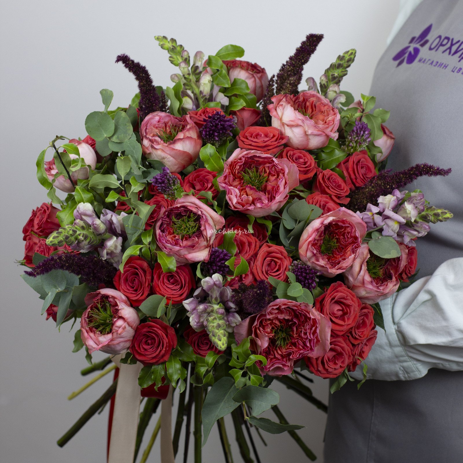 Состав: Роза пионовидная, Роза кустовая, Аллиум, Амарантус, Эвкалипт пучок, Питтоспорум, Лента Атласная, Тишью