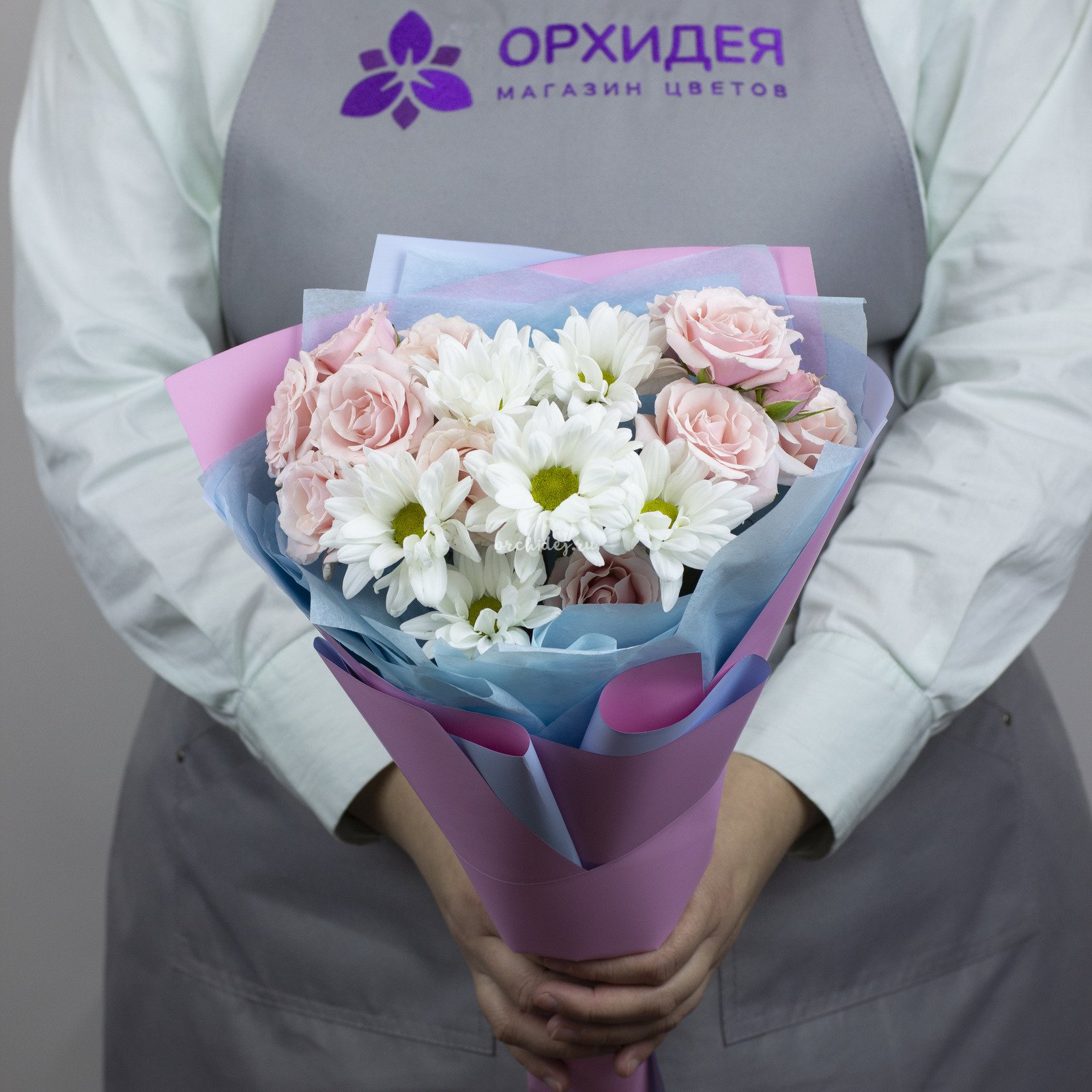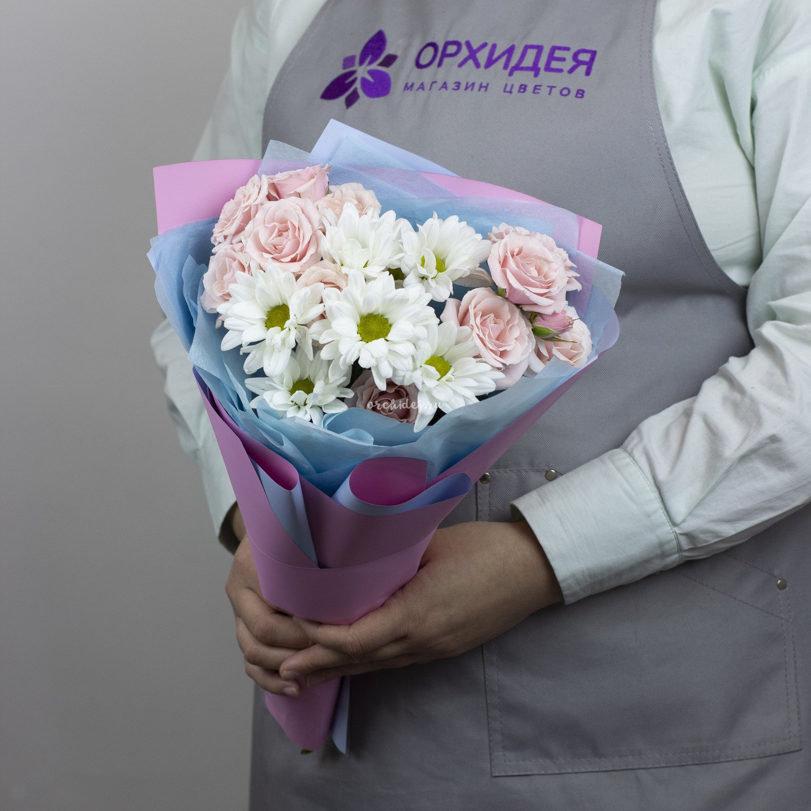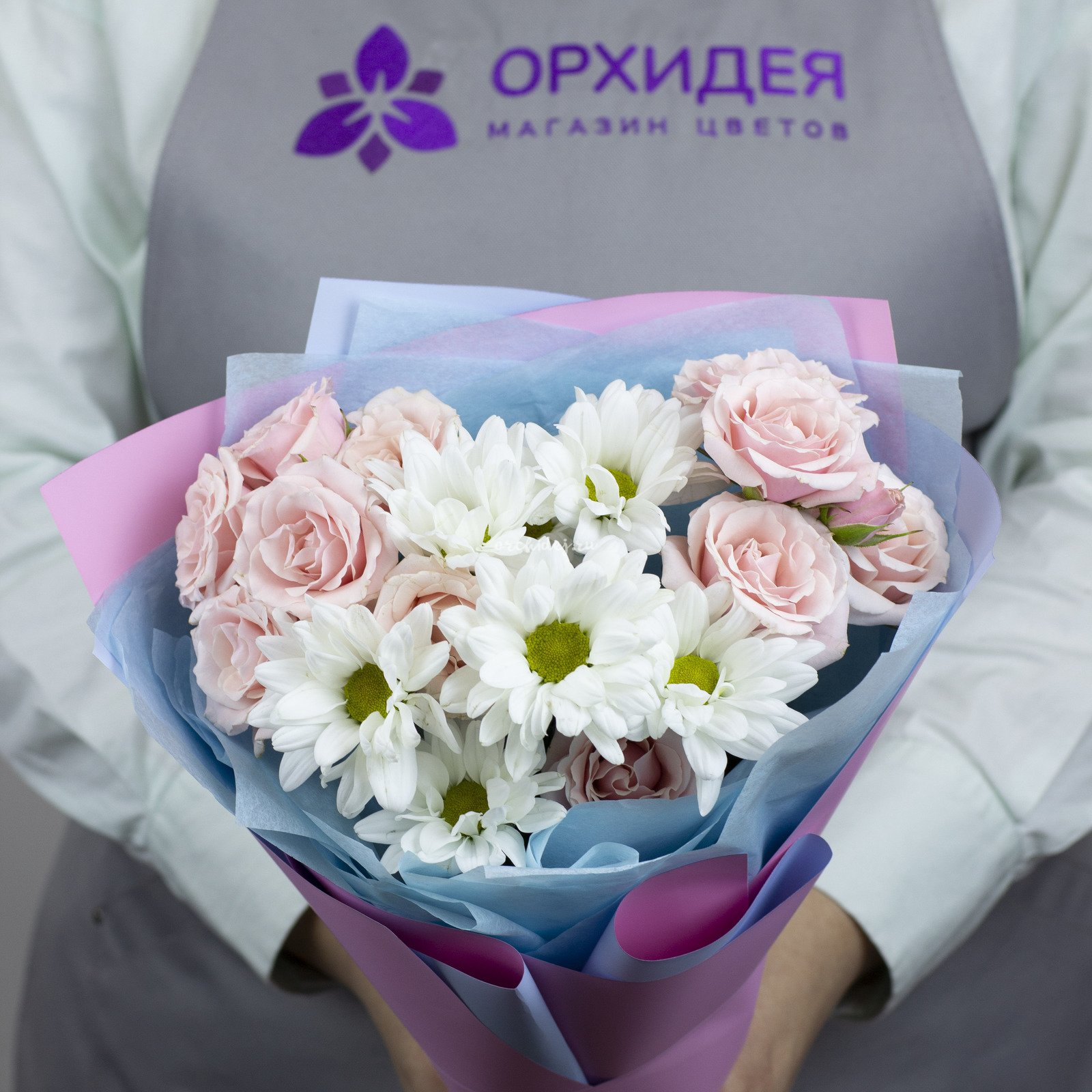 Состав: Роза кустовая, Хризантема ветка, Сложная упаковка 100, Тишью, Лента Атласная