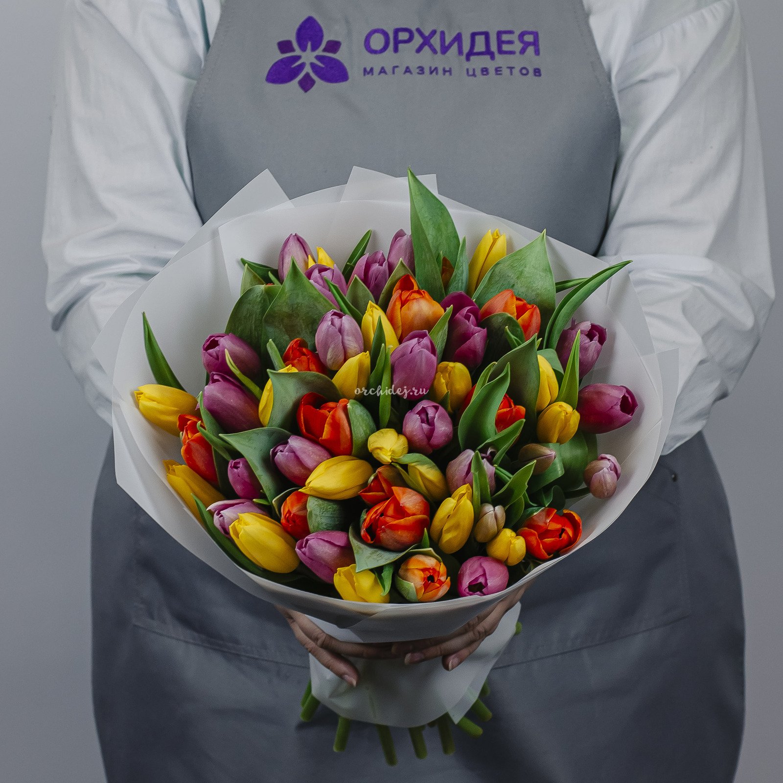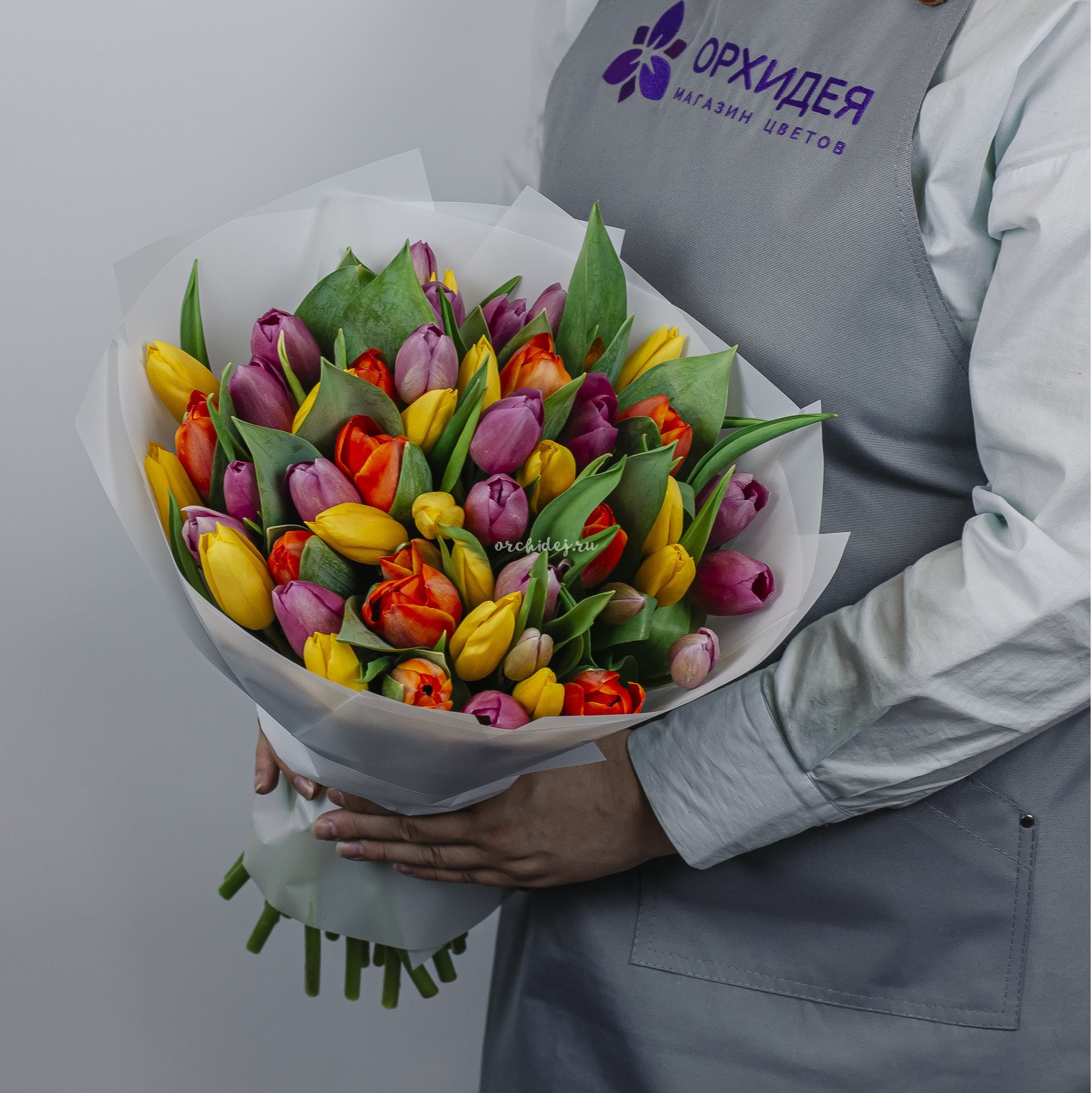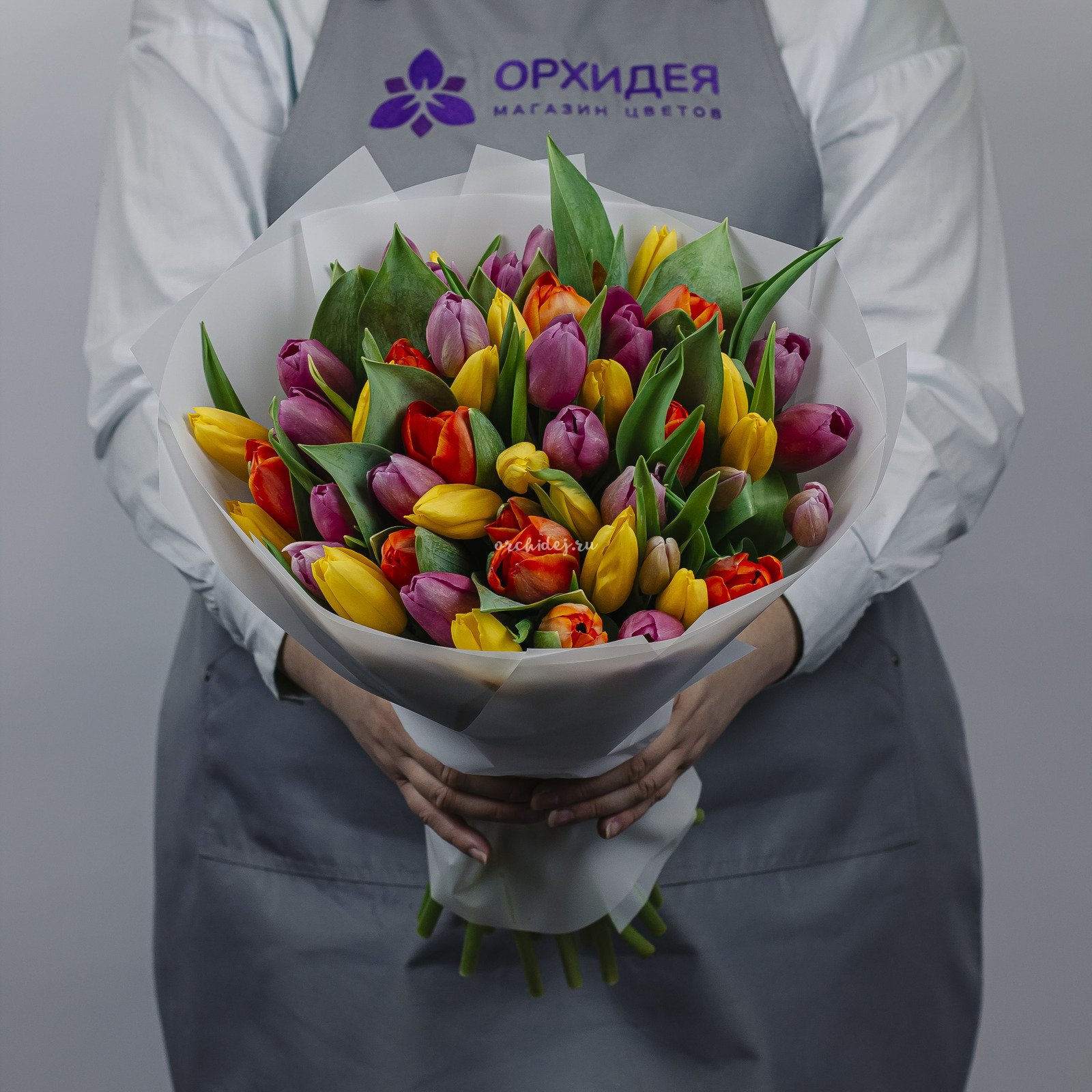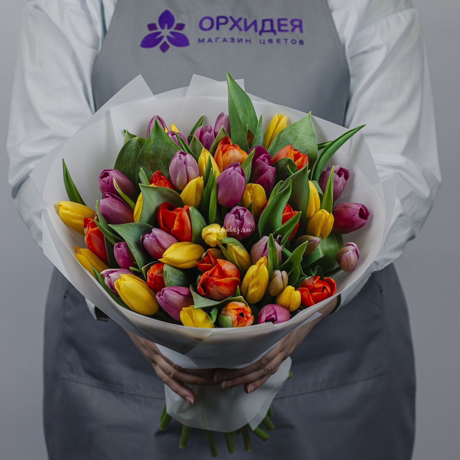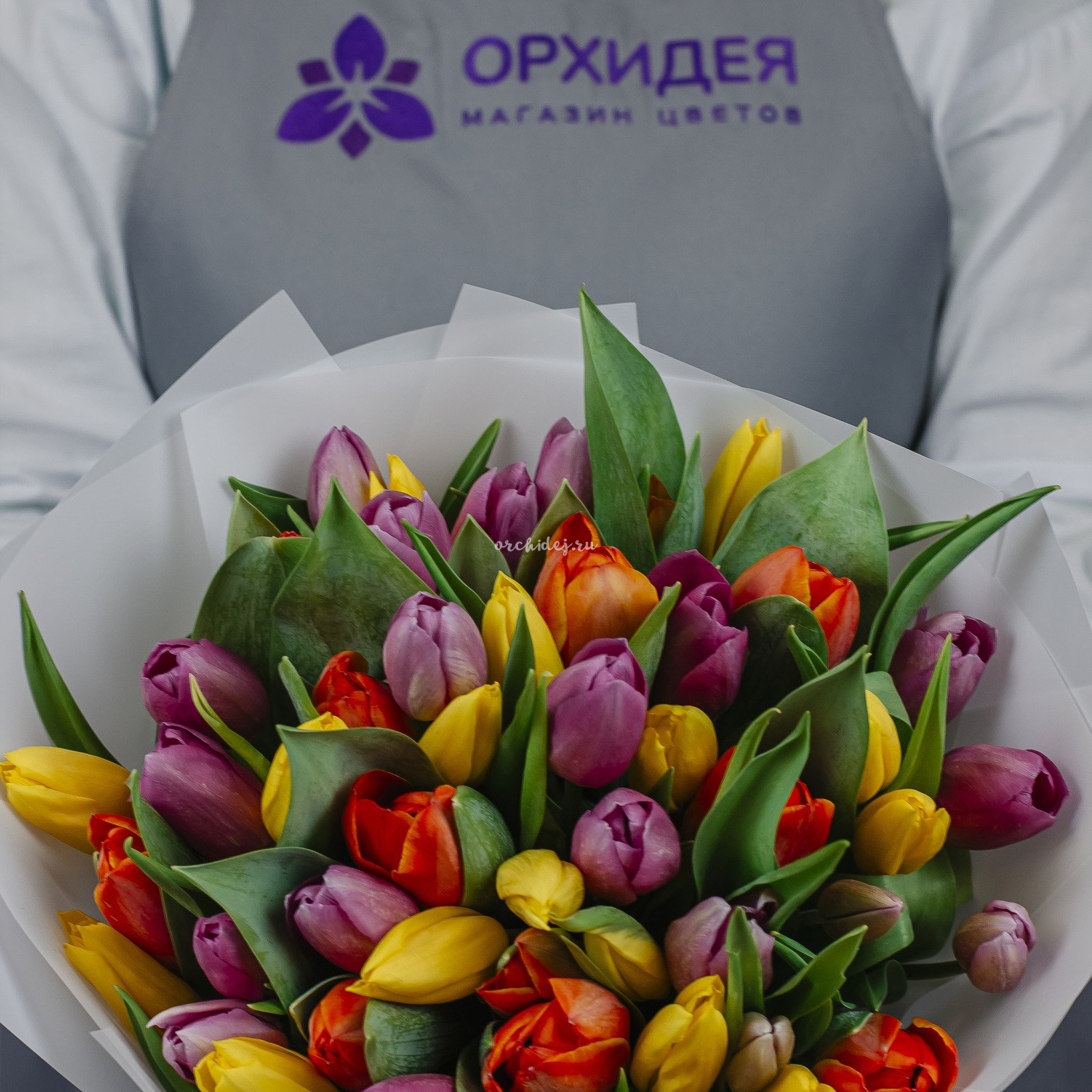 Букет состоит из 51 тюльпана различных оттенков, что позволяет создать яркую и насыщенную композицию.