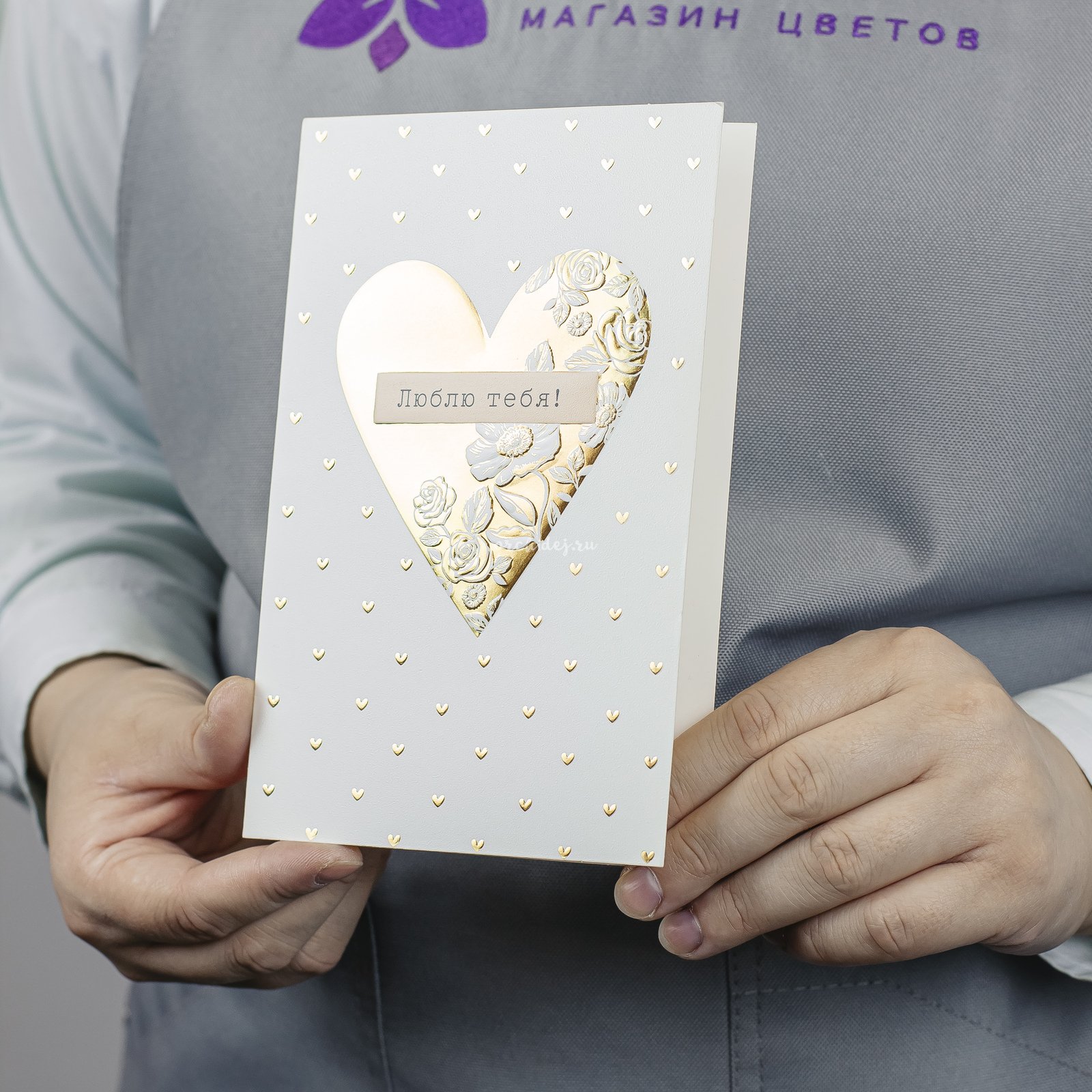Открытка выполнена в форме сердца, что придает ей особую нежность и романтичность. Золотистый цвет добавляет изысканности и богатства, делая открытку по-настоящему роскошной.
